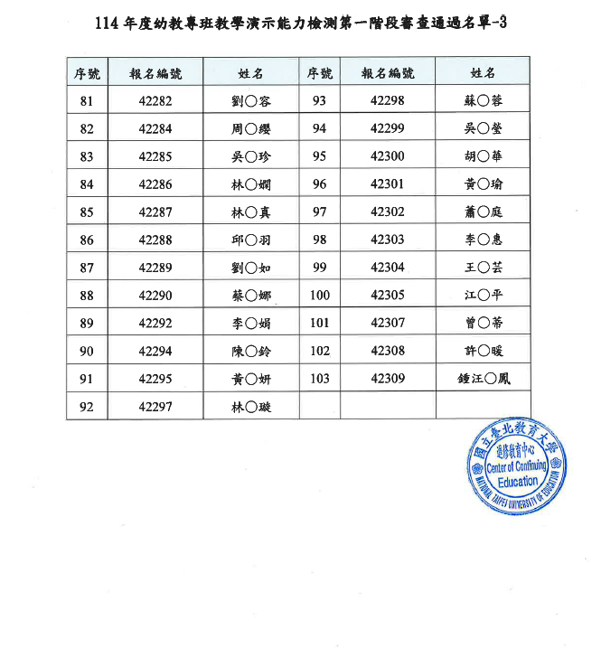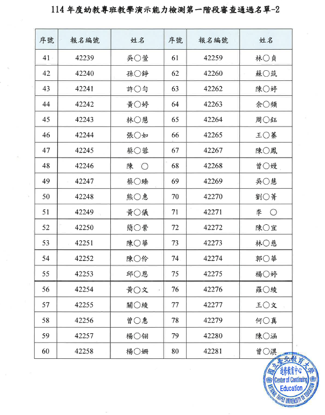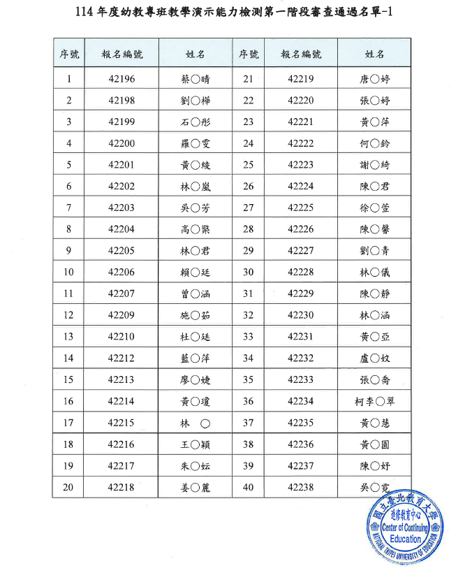 114年度幼教專班教學演示能力檢測第一階段通過名單公告